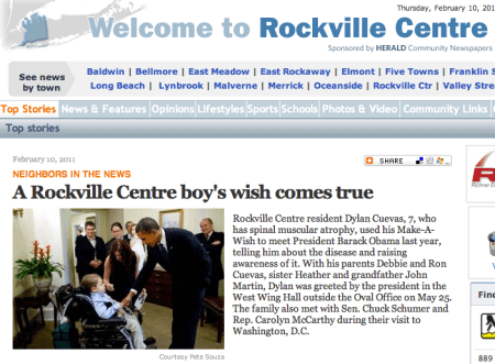 Rockville Centre resident Dylan Cuevas, 7, who has spinal muscular atrophy, used his Make-A-Wish to meet President Barack Obama last year, telling him about the disease and raising awareness of it. With his parents Debbie and Ron Cuevas, sister Heather and grandfather John Martin, Dylan was greeted by the president in the West Wing Hall outside the Oval Office on May 25. The family also met with Sen. Chuck Schumer and Rep. Carolyn McCarthy during their visit to Washington, D.C.