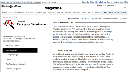 “You need to see a doctor,” the woman told her 27-year-old daughter. “Really,” she insisted. “I’m worried.” Her daughter, who lived several states away, was visiting, and when the mother happened to see her go up the stairs, she was struck by how odd this simple, everyday action looked. Her daughter’s slender hips rocked from side to side as she moved up the steps. It was as if she had to lift her entire body to bring up each leg. Her mother was certain that something was wrong.