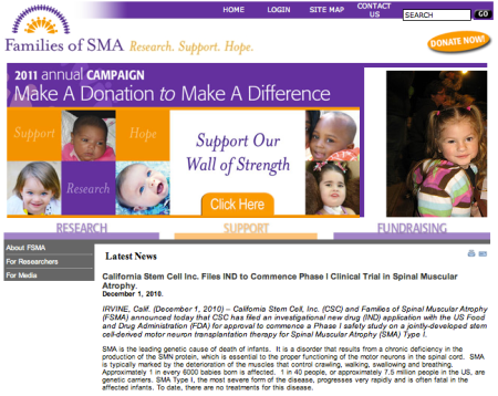 IRVINE, Calif. (December 1, 2010) – California Stem Cell, Inc. (CSC) and Families of Spinal Muscular Atrophy (FSMA) announced today that CSC has filed an investigational new drug (IND) application with the US Food and Drug Administration (FDA) for approval to commence a Phase I safety study on a jointly-developed stem cell-derived motor neuron transplantation therapy for Spinal Muscular Atrophy (SMA) Type I.