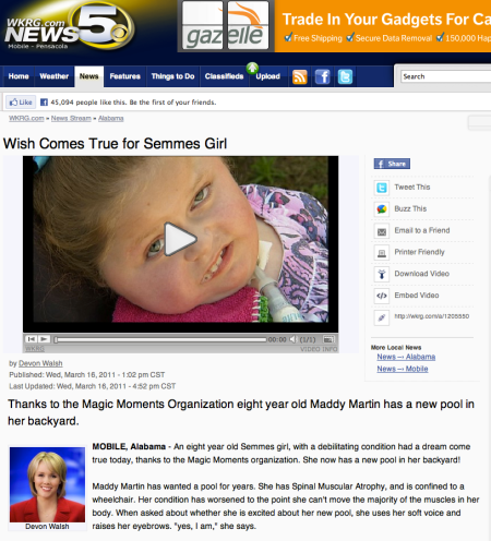 SEMMES, Alabama — Thanks to Magic Moments, an organization established in 1984 in Alabama to grant non-medical wishes to children 4-18 living in Alabama with life-threatening or life-altering medical conditions, there is a new saltwater swimming pool in Semmes at the house of Chris Martin.