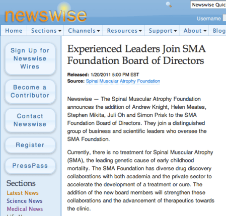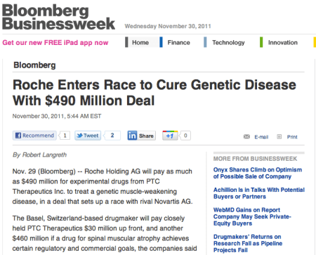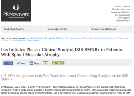 CARLSBAD, Calif., Dec. 19, 2011 /PRNewswire/ — Isis Pharmaceuticals, Inc. (NASDAQ: ISIS) announced today that it has initiated a Phase 1 study of ISIS-SMNRx in patients with spinal muscular atrophy (SMA). SMA is a severe motor-neuron disease that is the leading genetic cause of infant mortality. Isis is developing ISIS-SMNRx as a potential treatment for all Types of SMA.